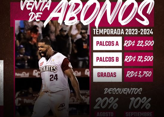 San Francisco de Macorís. -- El Equipo Gigantes del Cibao, informa a toda la fanaticada del béisbol que los abonos ya están a la venta para la serie regular de la próxima temporada 2023-24.