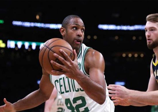 El centro de los Celtics de Boston, Al Horford (42), busca superar al delantero de los Indiana Pacers Domantas Sabonis, a la derecha, durante el segundo cuarto del Juego 2 de una serie de playoffs de primera ronda de baloncesto de la NBA, el miércoles 17 de abril de 2019, en Boston. (AP / CHARLES KRUPA)