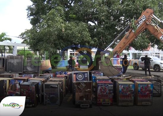 San Francisco De Macorís.- Decenas de máquinas tragamonedas, mofles y bocinas que fueron incautadas en diversas zonas de la provincia Duarte, fueron destruidas en la mañana del viernes 21 de junio.
