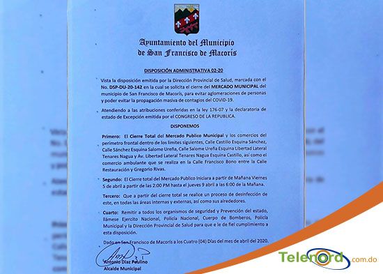 San Francisco De Macorís.- El Ayuntamiento Municipal dispuso mediante resolución administrativa, el cierre total del Mercado Público y comercios aledaños hasta el 9 de abril.
