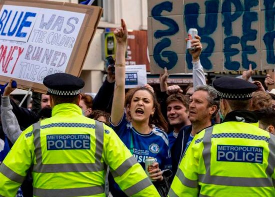 Cerca de un millar de aficionados de diferentes clubes ingleses dejaron a un lado por un día su rivalidad deportiva y se concentraron alrededor de Stamford Bridge para mostrar su oposición al proyecto, este martes antes del encuentro del Chelsea contra el Brighton.