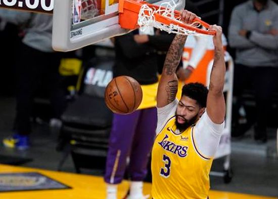 Anthony Davis de los Lakers de Los Ángeles anota una volcada el jueves 27 de mayo de 2021 frente a los Suns de Phoenix durante el tercer partido de la serie de playoffs entre ambos equipos, en Los Ángeles. (AP/Marcio José Sánchez)