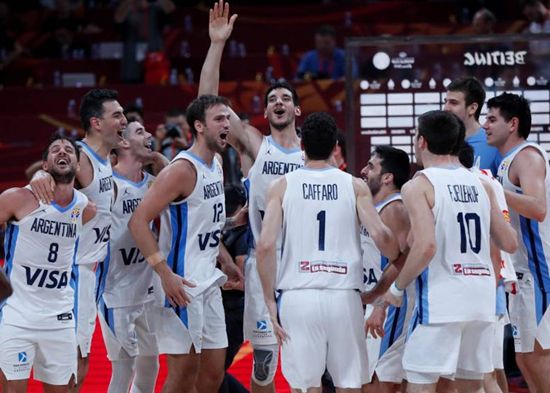 Jugadores de la selección de Argentina festejan después del triunfo ante Francia en las semifinales de la Copa del Mundo de la FIBA, en la Arena Cadillac, en Beijing, el viernes 13 de septiembre de 2019.