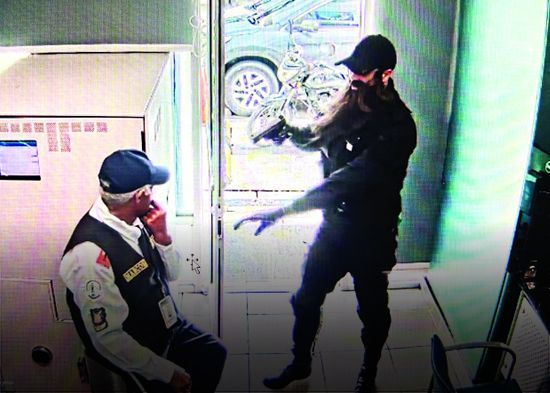 Las cámaras de seguridad de la entidad bancaria captaron el momento cuando los ladrones llegan al lugar y apuntan con un arma al guardia de seguridad.