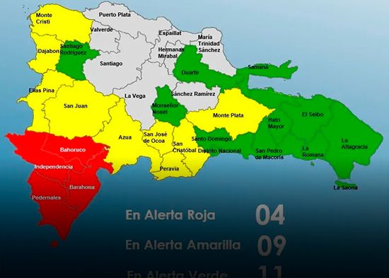El COE dice que se mantienen (4) provincias en alerta roja, (9) en alerta amarilla y (9) provincias en alerta verde, por posible Inundaciones repentinas urbanas y rurales, crecidas de ríos, arroyos y cañadas, así como deslizamientos de tierra.