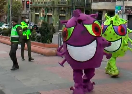 Efectivos de la Policía de La Paz (Bolivia) realizaron este lunes una ingeniosa campaña de concientización sobre el peligro de contagio del covid-19 disfrazándose de coronavirus.