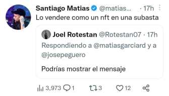 Pese a que Alofoke no respondió el tuit de Peguero, a otro usuario que le pidió mostrar el mensaje le contestó: “Lo venderé como un NFT en una subasta”.