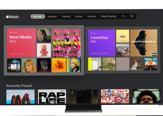Con Apple Music, disponible en los modelos de televisores del 2018 hasta el 2020, los suscriptores pueden acceder a más de 60 millones de canciones sin publicidad, ver videos musicales y explorar miles de listas de reproducción seleccionadas por expertos en música y creadores de tendencias mundialmente reconocidos.