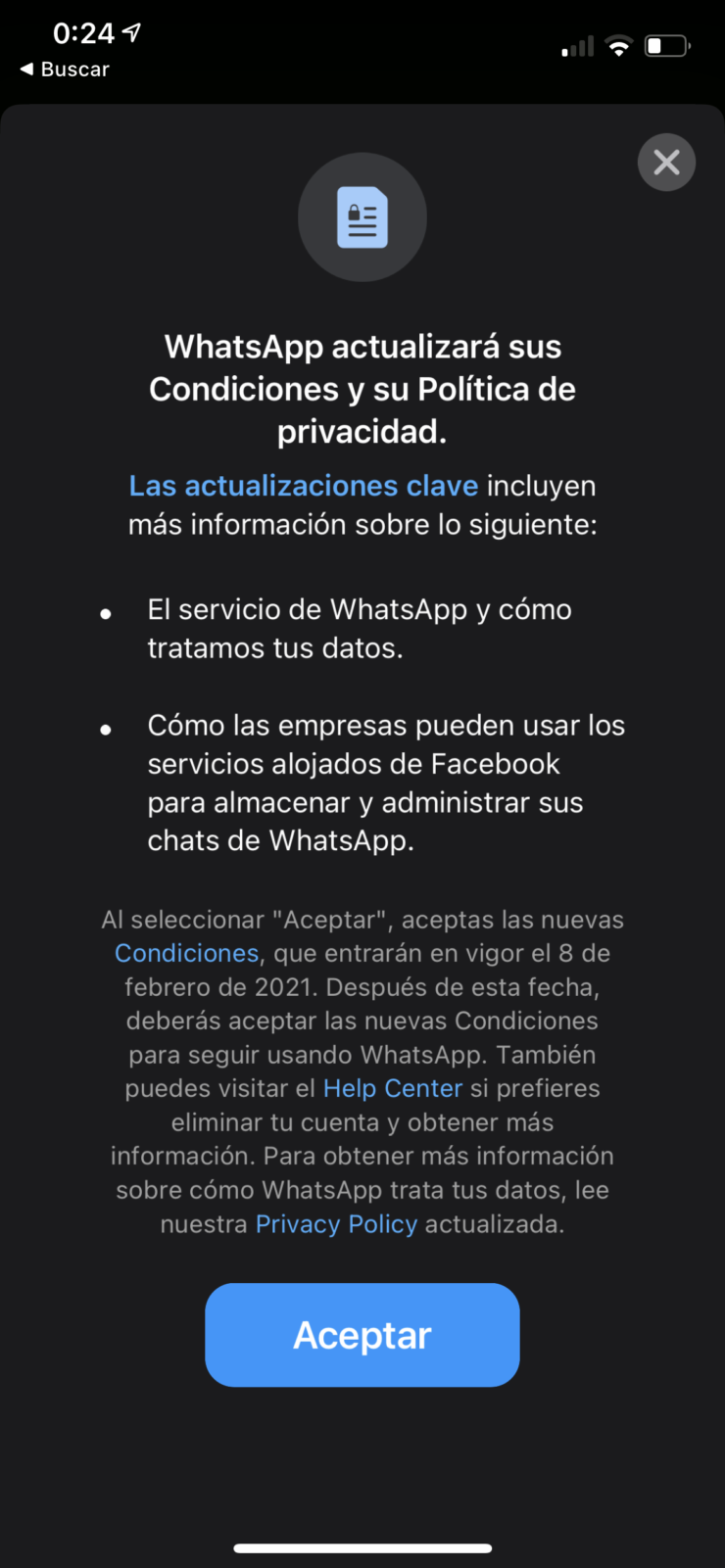 Ha funcionado como una especie de ultimátum por parte de Facebook, quienes adquirieron la aplicación en 2014. Aquellas personas que no aceptaron los nuevos términos, a partir de febrero 8 no podrán seguir usando WhatsApp.