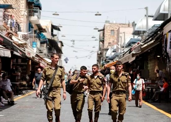 Soldados israelíes sin mascarillas en el mercado Mahane Yehuda en Jerusalén, 18 de abril de 2021. Israel pone fin al uso obligatorio de mascarillas al aire libre a partir del 18 de abril tras una exitosa campaña de vacunación, pero todavía es necesario llevarlas en interiores.