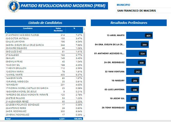 San Francisco De Macorís.- Con la casi totalidad de los colegios computados, Ariel Acosta es el pre-candidato más votado entre los regidores por el Partido (PRM) a la alcaldía local, obteniendo 405 votos.