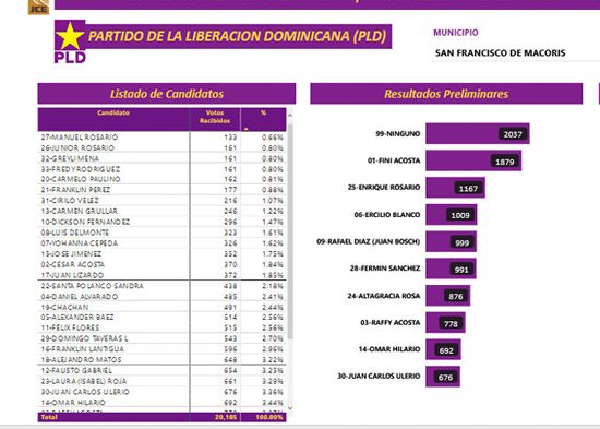San Francisco De Macorís.- Con el 100% de los colegios computados, Fini Acosta continúa siendo la pre-candidata más votada entre los regidores por el Partido De La Liberación Dominicana (PLD) a la alcaldía local, obteniendo 2,422 votos.