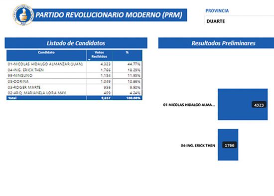 San Francisco De Macorís.- El empresario Nicolas Hidalgo con 5,525 votos, se mantiene en la cima del escrutinio, como más votado entre las cuatro candidaturas a diputado por el Partido Revolucionario Moderno (PRM), en las primarias celebradas el domingo 6 de octubre.