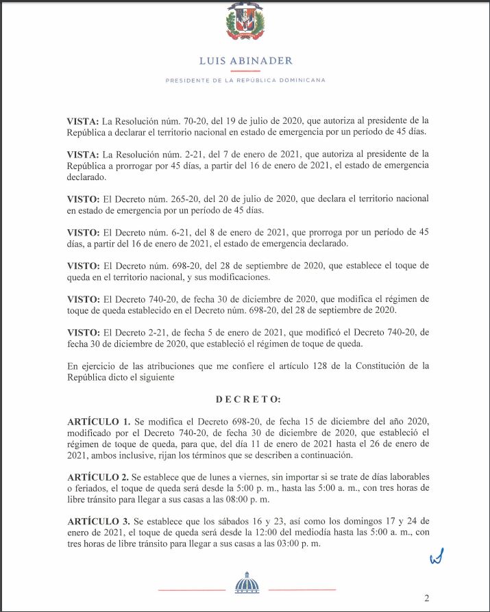 Con el decreto 7-21, el presidente de la República, Luis Abinader, informó la nueva fecha del toque de queda que regirá en el país y las nuevas normas con las cuales busca atenuar los contagios por COVID-19.