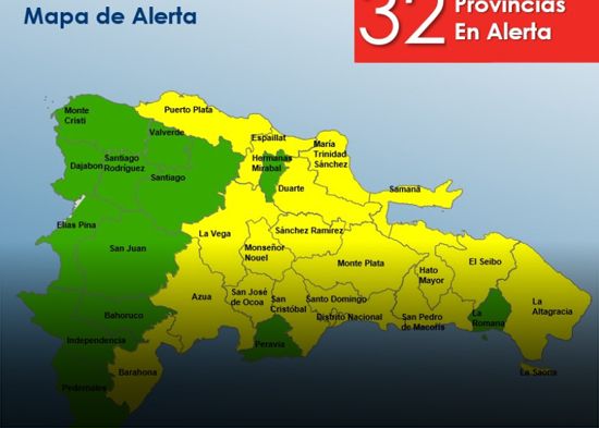 El Centro de Operaciones de Emergencias (COE) informó este viernes que mantiene 10 provincias en alerta amarilla y 22 en alerta verde, por posibles inundaciones repentinas urbanas y rurales, crecidas de ríos, arroyos y cañadas y deslizamientos de tierra.
