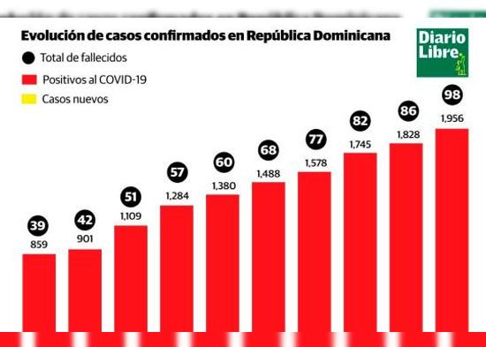 Doce fallecidos nuevos para un total de 98 y 1,956 casos confirmados de COVID-19