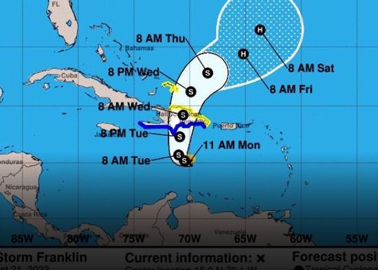 De momento, Franklin se encuentra a unos 370 kilómetros al sur de Santo Domingo y sus vientos máximos se mantienen en 85 kilómetros por hora, con ráfagas superiores.