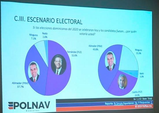 En el caso de que el candidato por el Partido Revolucionario Moderno (PRM) fuera Luis Abinader, y en el Partido de la Liberación Dominicana (PLD) Leonel Fernández en las elecciones de 2020, este ultimo ganaría con 52.6 % de los votos frente a un 37.7 que obtendría Abinader.